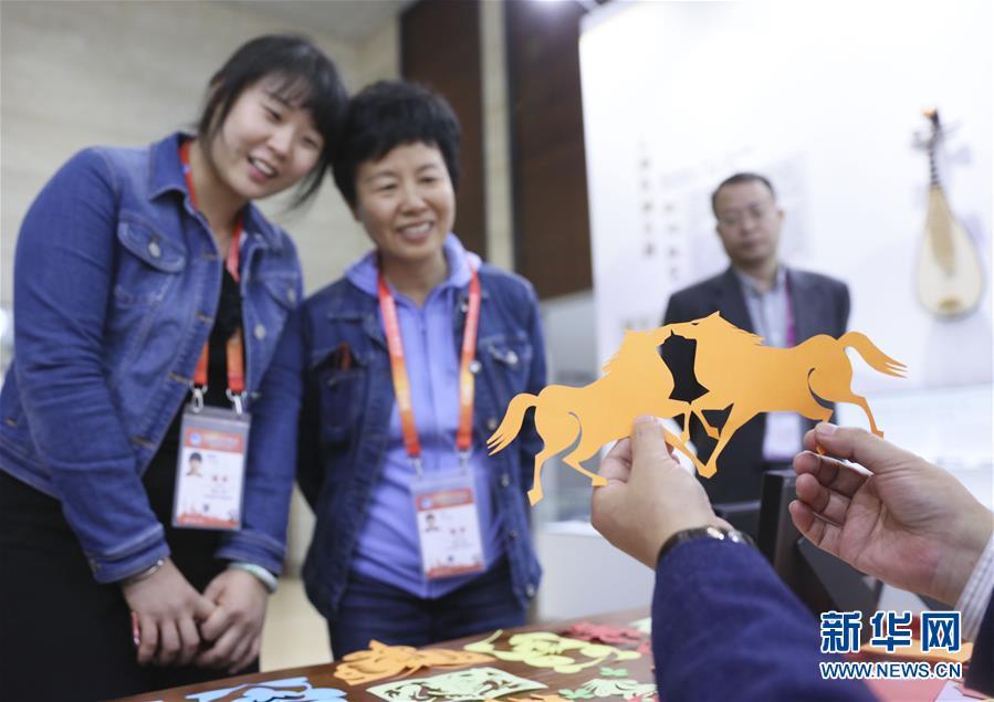 11月4日,在首屆中國國際進口博覽會新聞中心,媒體記者觀看中國傳統(tǒng)剪紙技藝展示。 新華社記者蘭紅光攝