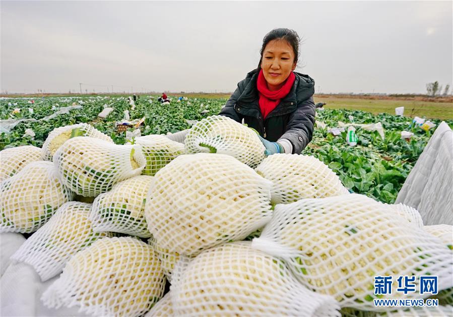 11月5日,唐山海港經(jīng)濟開發(fā)區(qū)王灘鎮(zhèn)東高各莊村的菜農(nóng)將收獲的菜花裝車。 新華社記者 楊世堯 攝