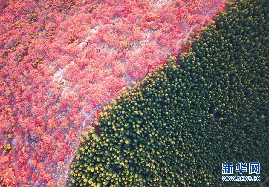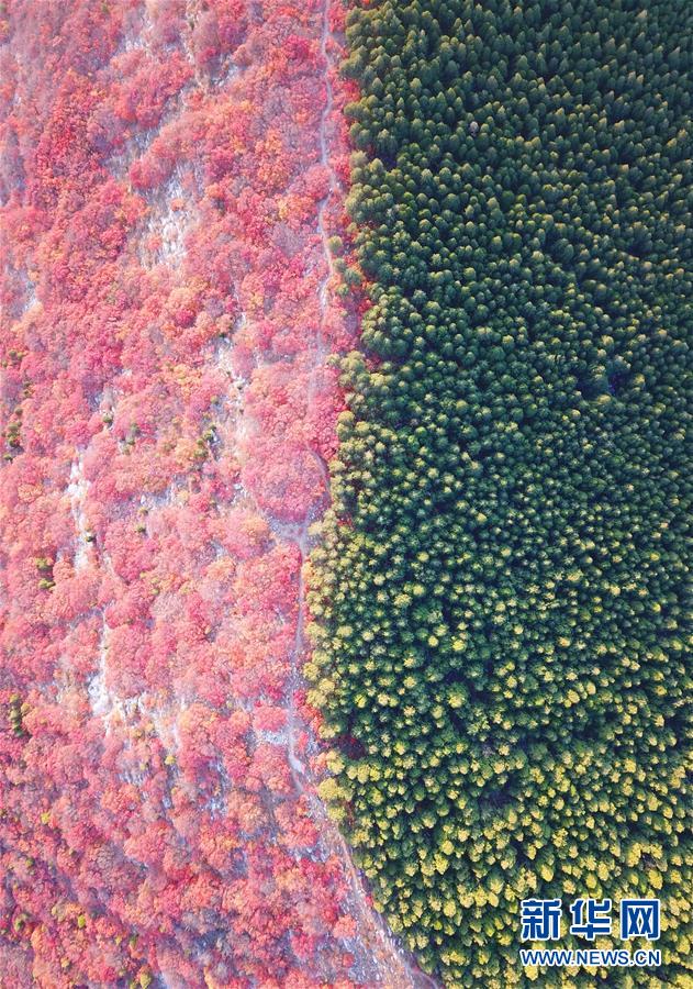 深秋時節(jié),山東濟南楔子山山脊兩邊種植的植被形成“一山雙色”景觀,令人稱奇。