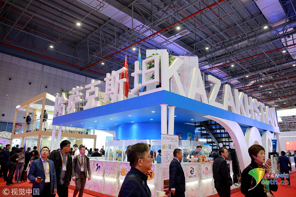 2018年11月6日,上海,首屆中國國際進口博覽會國家展上,共有82個國家、3個國際組織設(shè)立了71個展臺。哈薩克斯坦館。視覺中國