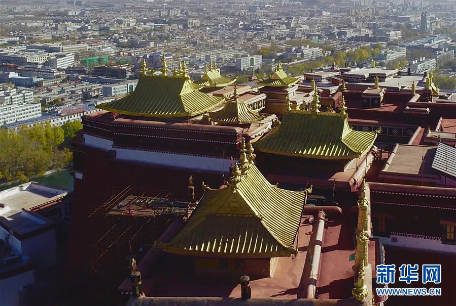 修繕后的布達(dá)拉宮金頂群(11月7日無(wú)人機(jī)拍攝)。