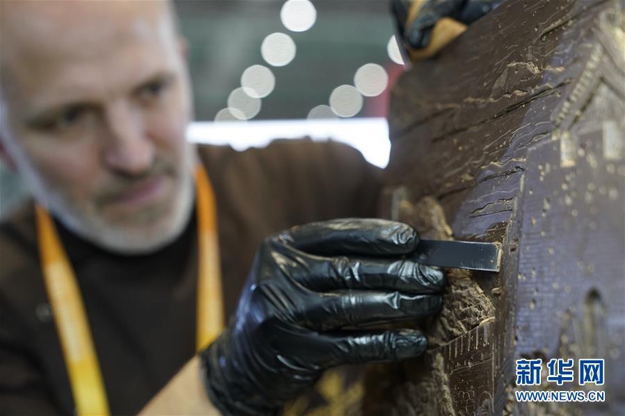 11月7日,在進(jìn)博會食品及農(nóng)產(chǎn)品展區(qū),來自俄羅斯的巧克力雕塑家維塔利·波諾馬廖夫在制作中國長城主題的巧克力雕塑作品。 新華社記者 沈伯韓 攝