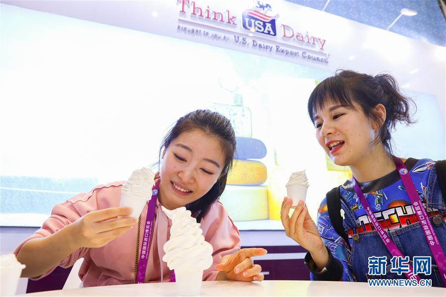 11月7日,兩位參觀者在進博會食品及農(nóng)產(chǎn)品展區(qū)美國乳品出口協(xié)會展臺品嘗冰激凌。 新華社記者 劉大偉 攝