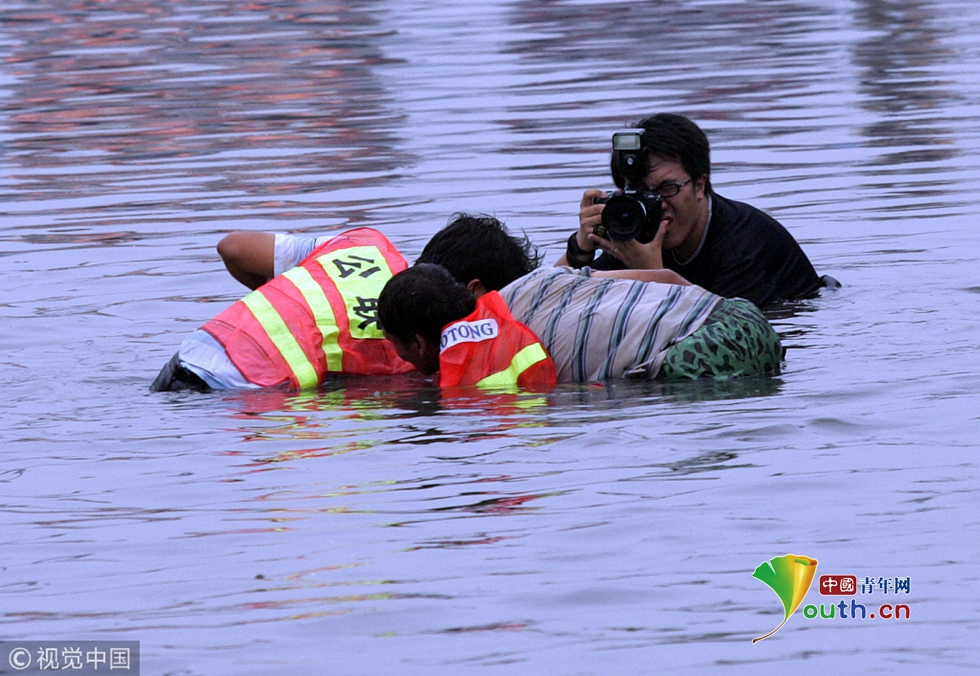 2007年8月6日,北京北三環(huán)安華橋雨后出現(xiàn)積水,這段北京最繁忙的道路之一的路段一度交通中斷,排險(xiǎn)人員緊急趕到現(xiàn)場(chǎng)做出排水等應(yīng)急舉措。圖片作者:王玨茜/視覺中國(guó)