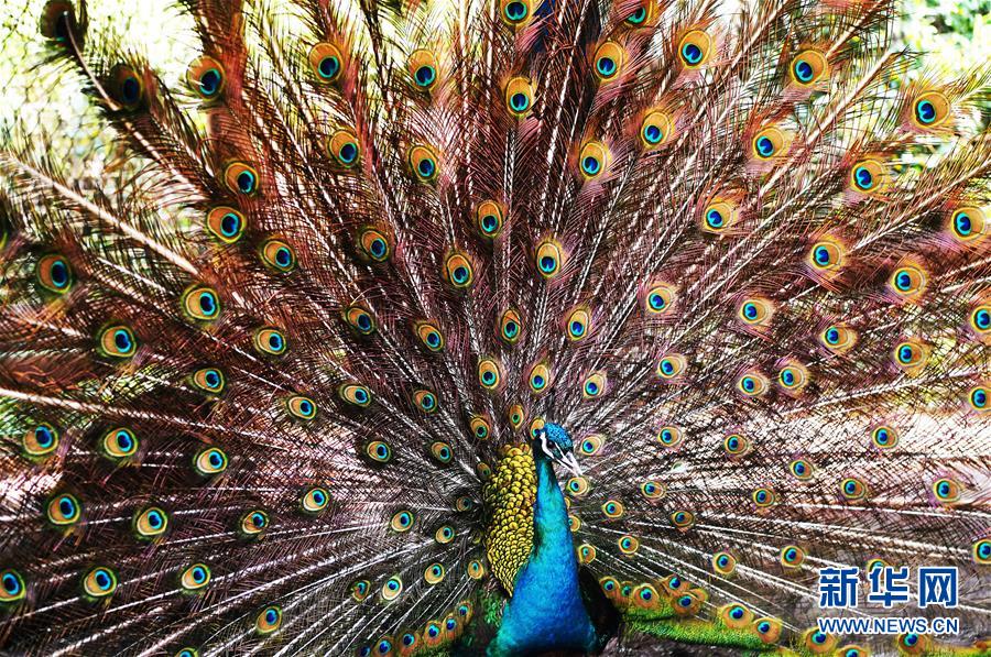 5月16日,在重慶市銅梁區(qū)永嘉鎮(zhèn)高龍村藍孔雀養(yǎng)殖場內(nèi),一只藍孔雀開屏。 新華社記者 王全超 攝