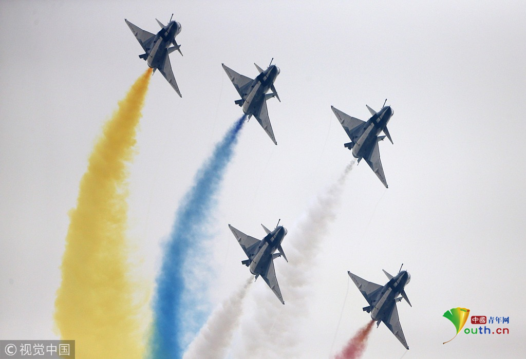 2018年11月8日,廣東珠海,第十二屆中國(guó)國(guó)際航展第三天??哲姟鞍艘弧憋w行表演隊(duì)的隊(duì)員們,發(fā)揚(yáng)連續(xù)作戰(zhàn)精神,給觀眾們表演了七機(jī)分組開(kāi)花、四機(jī)編隊(duì)橫滾等高難動(dòng)作,受到觀眾們的稱(chēng)贊。視覺(jué)中國(guó)