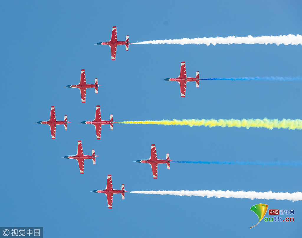 2018年11月7日,廣東珠海,第12屆珠海航展在金灣機(jī)場(chǎng)如火如荼進(jìn)行。空軍航空大學(xué)“紅鷹”飛行表演隊(duì)在第十二屆中國(guó)航展進(jìn)行了飛行表演,展示了飛行員精湛的飛行技能。視覺中國(guó)