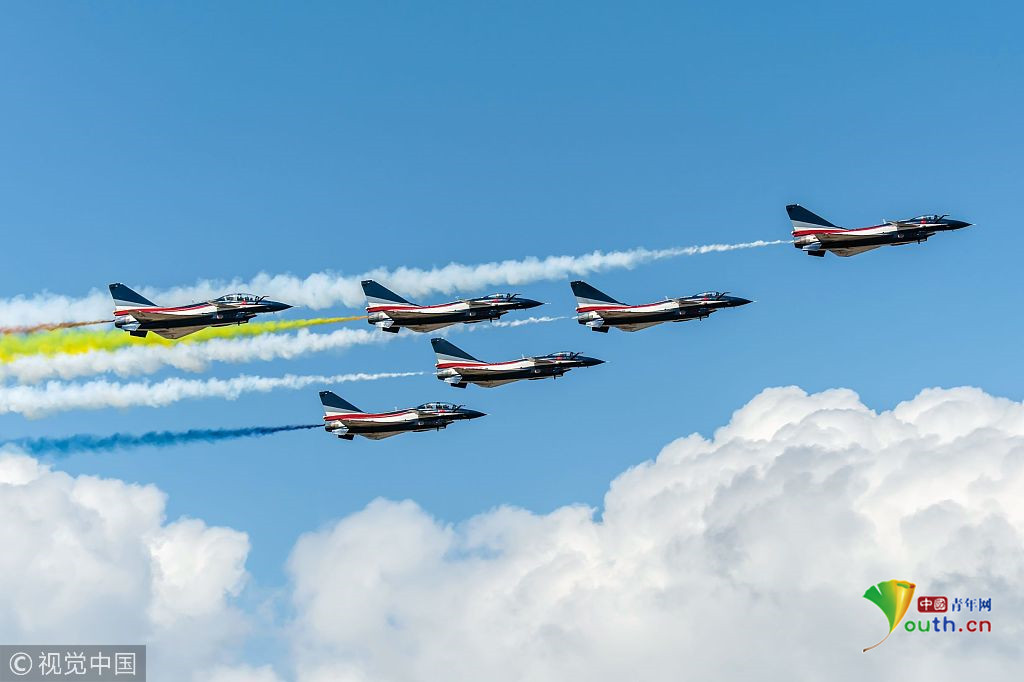 圖三:2018年11月6日,廣東珠海航展上,八一飛行表演隊(duì)駕駛著殲-10A飛機(jī)劃過(guò)天空。