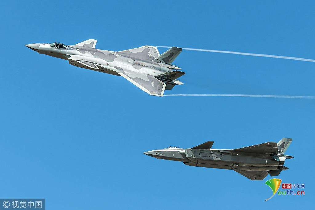 圖五:2018年11月6日,廣東珠海航展上,兩架殲-20戰(zhàn)機(jī)組成雙機(jī)編隊(duì)進(jìn)行飛行表演。