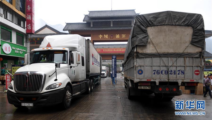 在廣西憑祥市浦寨邊貿(mào)區(qū),東盟國家的貨車進(jìn)出運(yùn)貨(1月16日攝)。新華社記者 張愛林 攝
