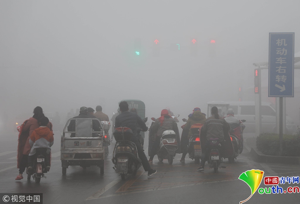 2018年11月12日,河南平頂山寶豐縣出現(xiàn)大霧, 街頭汽車(chē)打開(kāi)霧燈,行人小心行走。