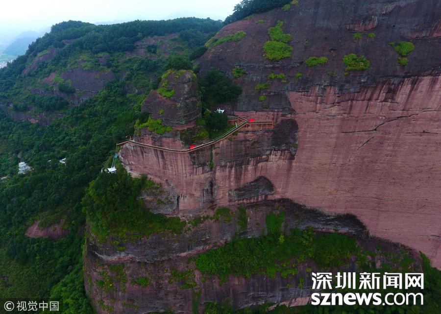深圳新聞網(wǎng)訊 2018年6月19日,航拍江西贛州南武當(dāng)山百米高空玻璃棧道。棧道緊貼峭壁,在懸崖之上凌空蜿蜒穿行,猶如一條玉龍盤旋在綠林石海之中。 南武當(dāng)山位于江西最南端的龍南縣武當(dāng)鎮(zhèn)境內(nèi),景區(qū)核心面積達到13.5平方公里,擁有99座千姿百態(tài)的巍峨石峰,丹霞地質(zhì)風(fēng)貌突出,連綿十里,被稱為“武當(dāng)十里畫廊”。