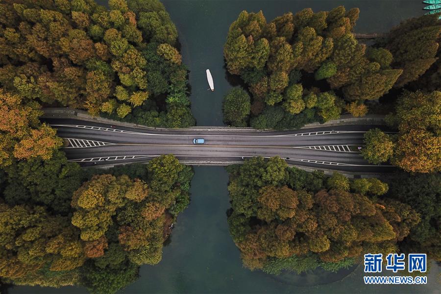 11月13日,一艘游船在杭州西湖上行駛(無(wú)人機(jī)拍攝)。 時(shí)值初冬,杭州市西湖景區(qū)層林盡染,色彩斑斕,別有一番韻味。
