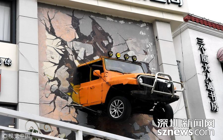 訊 2018年11月13日,在廈門市區(qū)環(huán)島路上,一輛裝飾在建筑墻面上的汽車,結合3D圖案讓人感覺汽車“破”墻而出,創(chuàng)意十足。