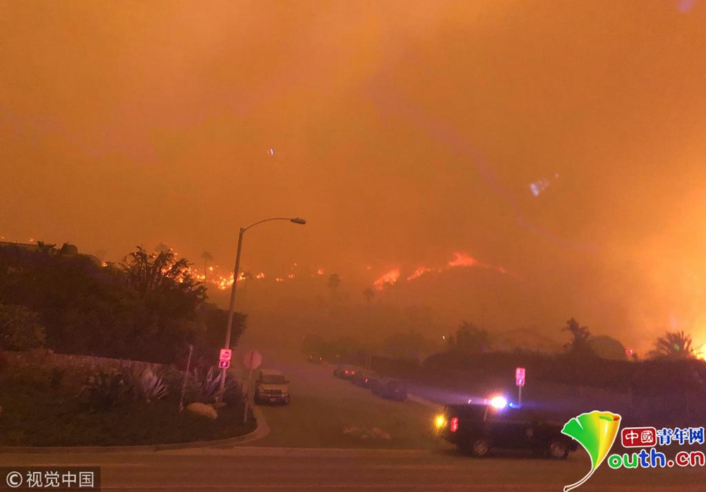 山火迅速蔓延至剛剛發(fā)生槍擊案的千橡樹市,并在9日翻過圣莫妮卡山,在強風(fēng)的助力下向海邊蔓延。
