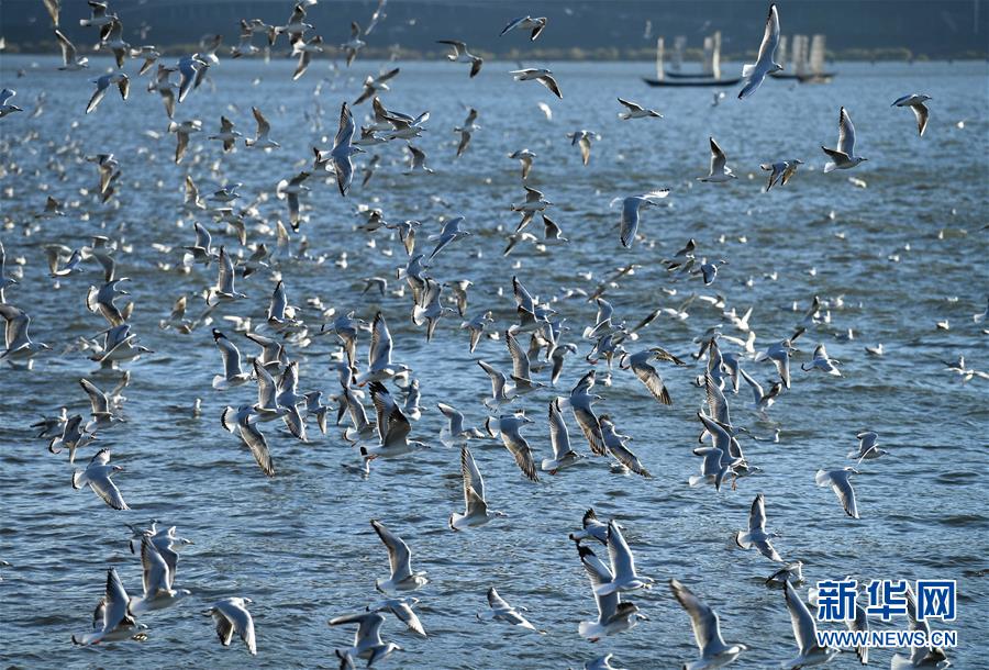 這是11月14日拍攝的在昆明滇池上飛翔的紅嘴鷗?!⌒氯A社記者 藺以光 攝