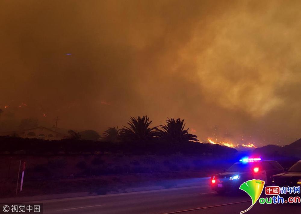 山火迅速蔓延至剛剛發(fā)生槍擊案的千橡樹市,并在9日翻過圣莫妮卡山,在強風的助力下向海邊蔓延。