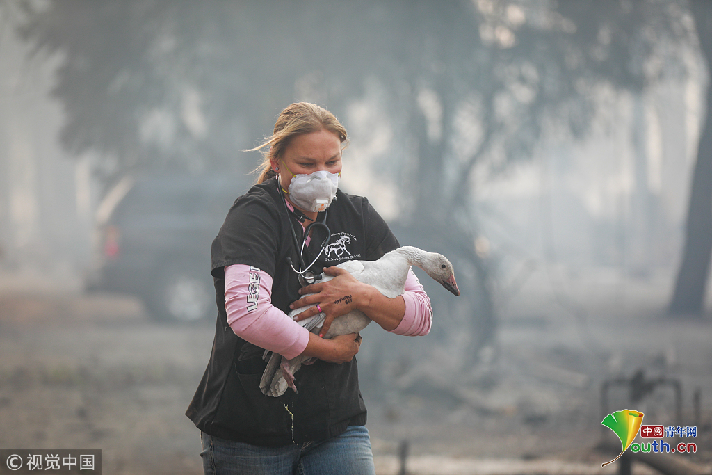 當(dāng)?shù)貢r(shí)間2018年11月10日,美國(guó)加州Paradise,當(dāng)?shù)厣交鹚僚?,?zāi)區(qū)民眾紛紛帶領(lǐng)家畜進(jìn)行轉(zhuǎn)移。自本周三開(kāi)始,加州多地發(fā)生山火,火勢(shì)蔓延迅猛,數(shù)萬(wàn)人被迫撤離,數(shù)以萬(wàn)計(jì)的房屋被燒毀。圖片作者:Jessica Christian