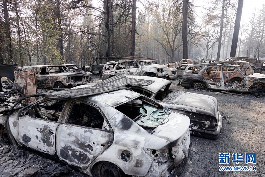 這是11月19日在美國加利福尼亞州比尤特縣天堂鎮(zhèn)拍攝的車輛殘骸和房屋廢墟。新華社記者吳曉凌攝