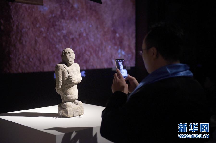 11月21日,觀眾在中國(guó)美術(shù)館拍攝展出作品“唐石人像”。新華社記者 魯鵬 攝