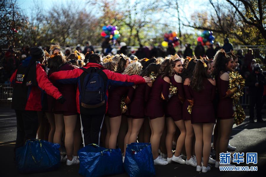 11月22日,在美國紐約感恩節(jié)大游行開始前,演員們抱團取暖。