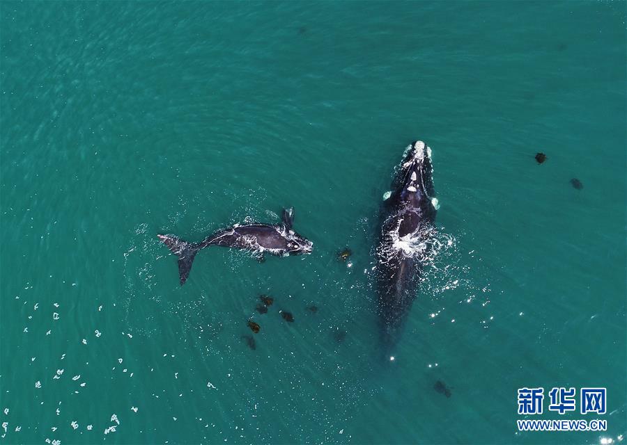 9月30日,在南非赫曼紐斯小鎮(zhèn)附近海面上,2頭南露脊鯨在海岸邊暢游。9月29日,位于開普敦以東約115公里的赫曼紐斯小鎮(zhèn)迎來2018年的鯨魚節(jié),來自世界各地的游客可乘船出海觀鯨,也可在岸邊等待鯨魚的到來。新華社記者陳誠攝