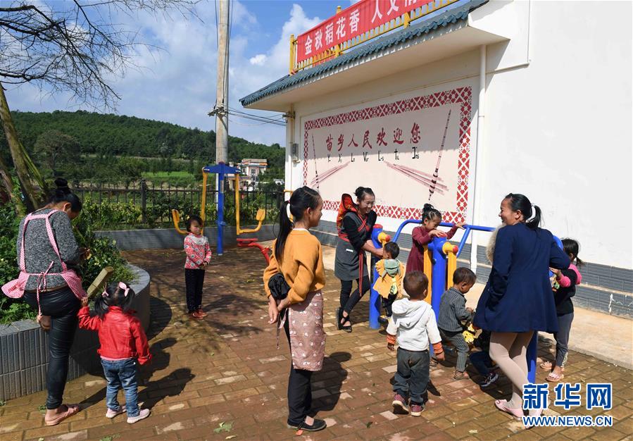 10月6日,在尋甸回族彝族自治縣塘子街道小海村,家長帶著孩子在村里的休閑健身廣場玩耍。國慶節(jié)期間,云南省尋甸回族彝族自治縣塘子街道小海村一片喜慶祥和。人們身著節(jié)日盛裝,載歌載舞,歡慶搬入新居后的第一個國慶節(jié)。新華社記者楊宗友攝