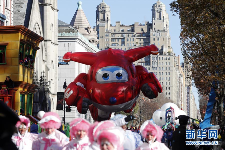 當(dāng)日,第92屆梅西感恩節(jié)大游行在紐約舉行,各式各樣的玩偶?xì)馇?、花車隊伍在曼哈頓的摩天大樓間穿行,吸引數(shù)百萬民眾前來觀看。梅西感恩節(jié)大游行始于1924年,是全美規(guī)模最大的感恩節(jié)游行。