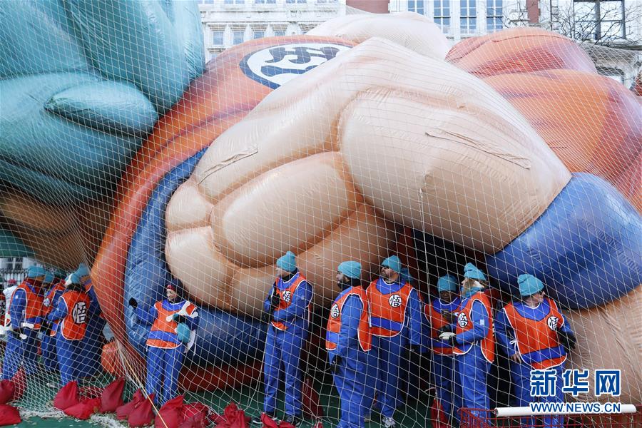 11月22日,在美國紐約感恩節(jié)大游行開始前,氣球操縱人員進行準備工作。