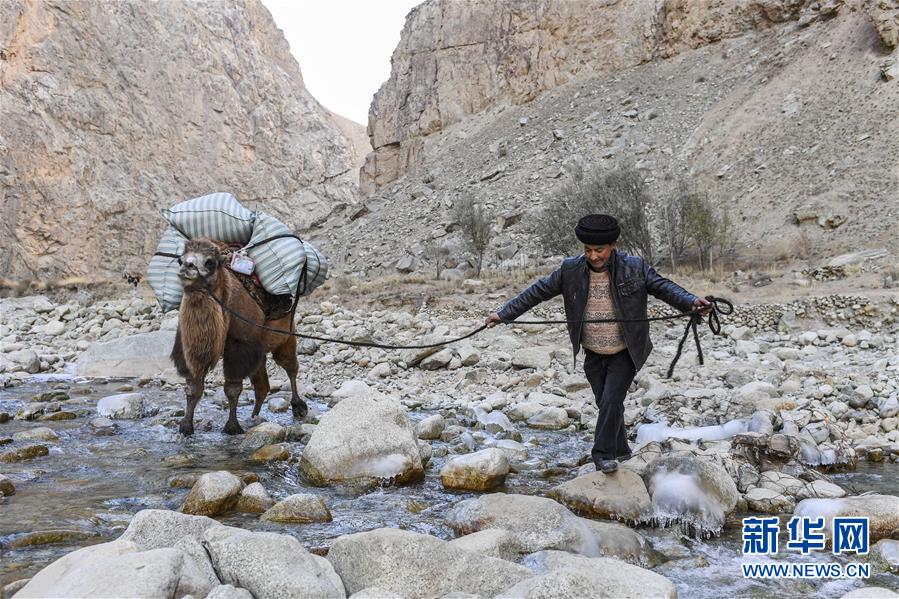 都熱·加爾曼牽著馱有搬遷行李的駱駝走在喀喇昆侖山中(11月17日攝)。