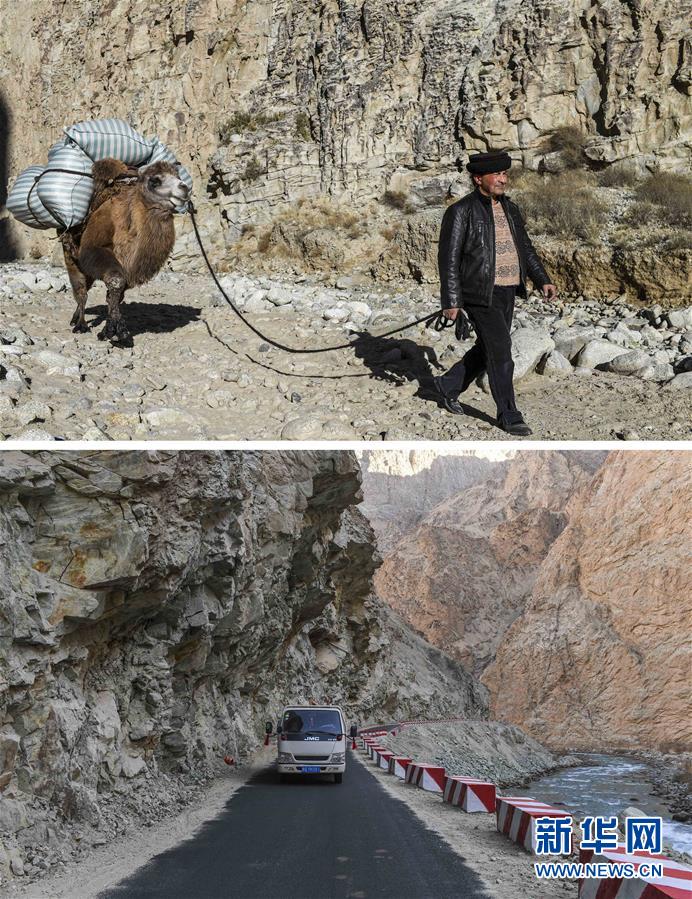 拼版照片:上圖為都熱·加爾曼牽著馱有行李的駱駝走在通往阿克托尕欄桿村村委會(huì)的路上;下圖為都熱·加爾曼乘坐汽車從大同鄉(xiāng)前往塔提庫力易地扶貧搬遷安置點(diǎn)(11月17日攝)。新華社記者胡虎虎攝