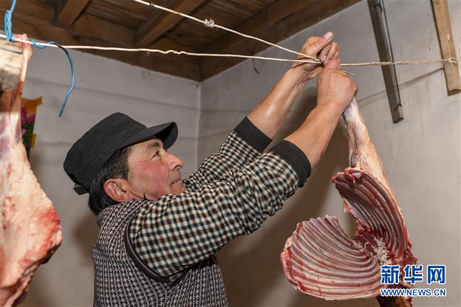 出發(fā)的前一天,都熱·加爾曼把分割好的羊肉掛在家中,這是他特意為暫時(shí)留守在家中的妻子和老人準(zhǔn)備的(11月16日攝)。新華社記者胡虎虎攝