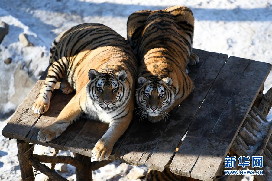 在橫道河子東北虎林園散放區(qū),兩只東北虎在木架子上休息(11月21日攝)。新華社記者王建威攝