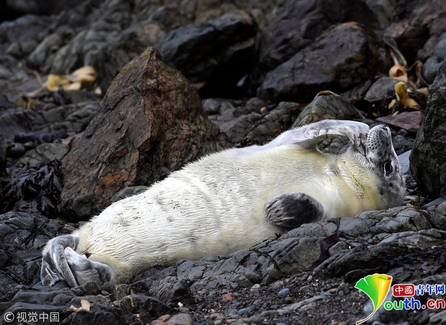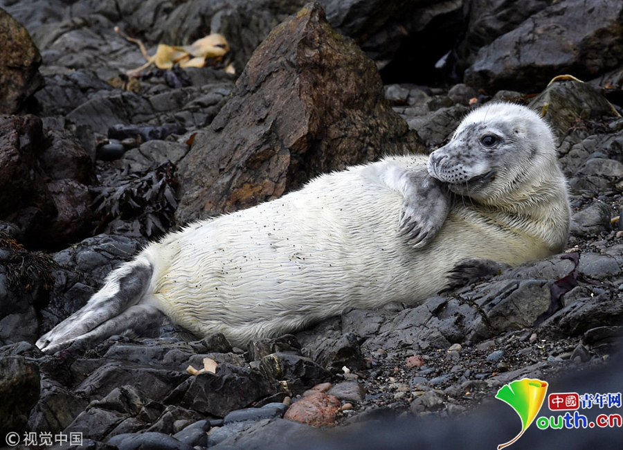 中國青年網(wǎng)北京10月9日電 當?shù)貢r間2018年10月8日,英國彭布羅克郡,一只大西洋海豹幼崽躺在海邊礁石上。海豹幼崽出生時都有毛茸茸的白色非防水皮毛,它們會在第四周蛻皮。