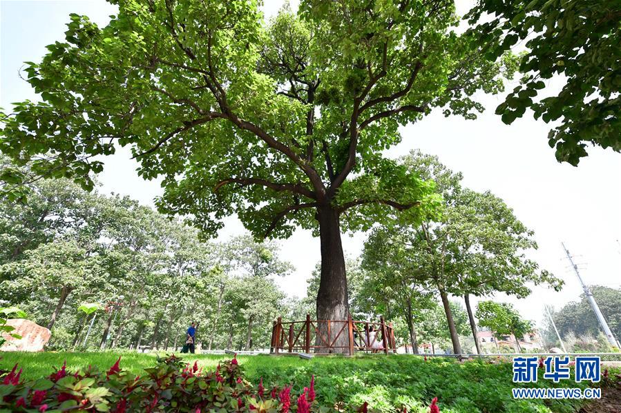 在河南蘭考縣焦裕祿干部學(xué)院門口,游客從“焦桐”下走過(2017年8月9日攝)。新華社記者馮大鵬攝
