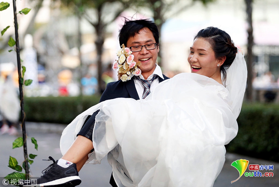當(dāng)?shù)貢r間2018年11月24日,泰國曼谷舉辦新娘賽跑活動,獲勝者將獲得婚禮的全額資助,眾多新娘在街頭提裙狂奔。圖為甜蜜合影。