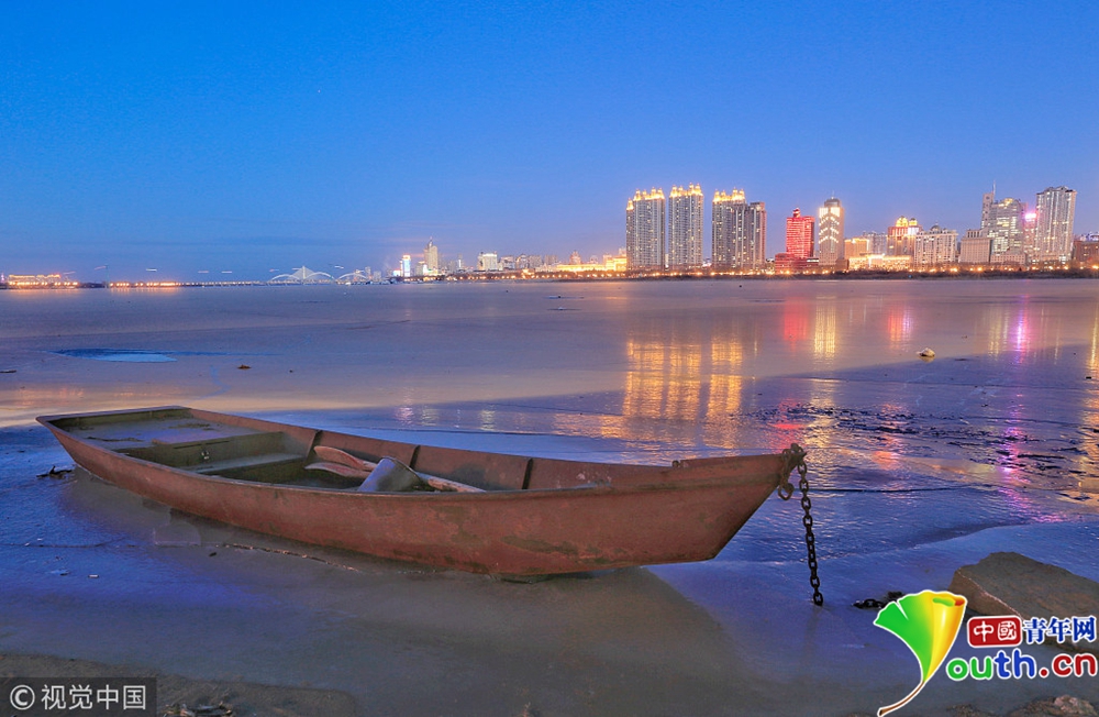 松花江封江 冰面如鏡倒影冰城夜景