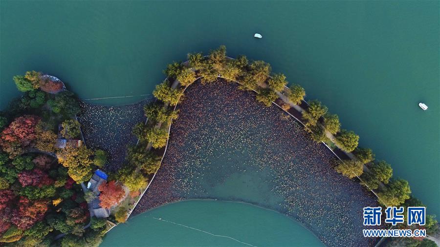 兩只小船行駛在湖南烈士公園年嘉湖湖面(11月25日無人機(jī)拍攝)。新華社記者 李尕攝