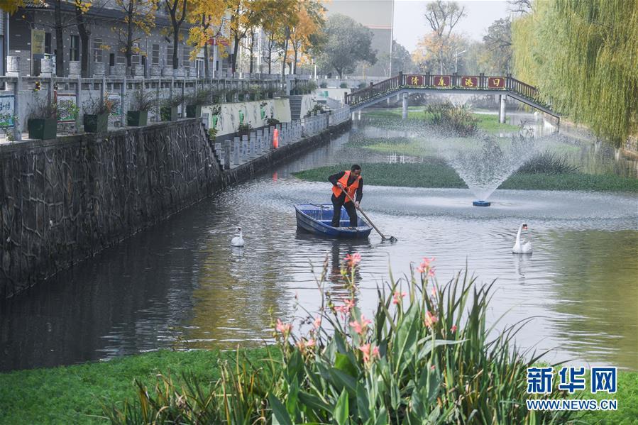 11月28日,林城鎮(zhèn)北湯村河長黃雙喜(右)在施家邊河打撈水面漂浮物。近年來,北湯村全面推進“五水共治”,停止河道內(nèi)的水產(chǎn)養(yǎng)殖,并進行河道清淤,整治周邊環(huán)境,另外還結(jié)合北湯生態(tài)園旅游項目,發(fā)展旅游經(jīng)濟,打造水上娛樂設(shè)施。現(xiàn)在北湯村施家邊河道水質(zhì)清澈,環(huán)境秀美,每年為北湯村吸引游客18萬人次。 新華社記者 徐昱 攝