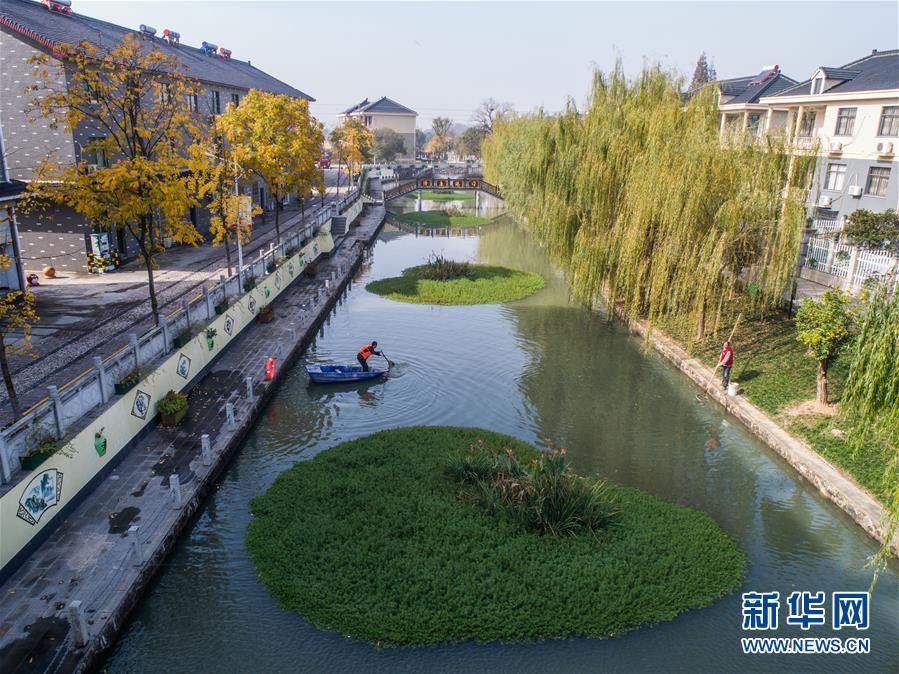 11月28日,長興縣虹星橋鎮(zhèn)港口村東港內(nèi),工作人員在打撈水面漂浮物(無人機拍攝)。東港全長1500米,環(huán)繞港口新村。2012年,新村建成后,港口村通過加固河岸、清理河道、種植浮草等方式對東港進行生態(tài)治理,并由該村黨總支書記孫根法擔任河長,定期開展巡查,引導(dǎo)村民自覺維護河道整潔。 新華社記者 徐昱 攝