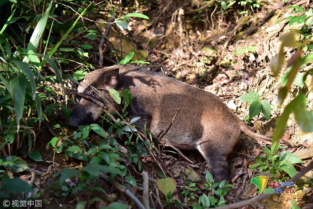 山豬個(gè)頭不大,身長(zhǎng)1米左右,毛色呈深褐色。從體型判斷,這只山豬應(yīng)該體重在35公斤左右,估計(jì)年齡只有1歲。