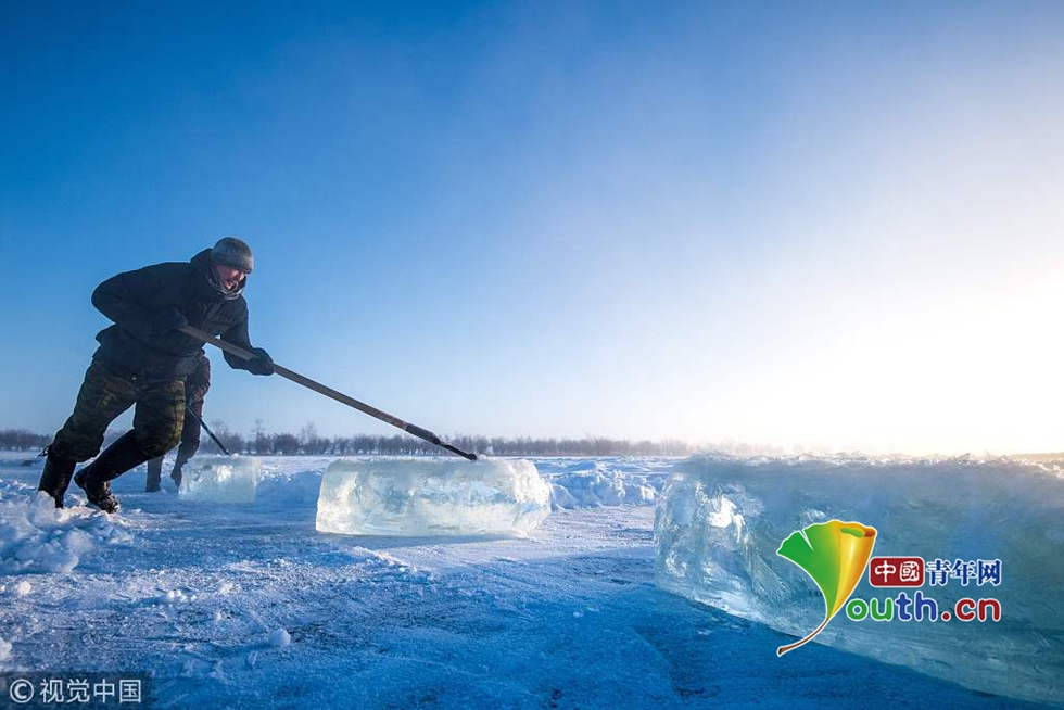 圖為村民采集冰塊