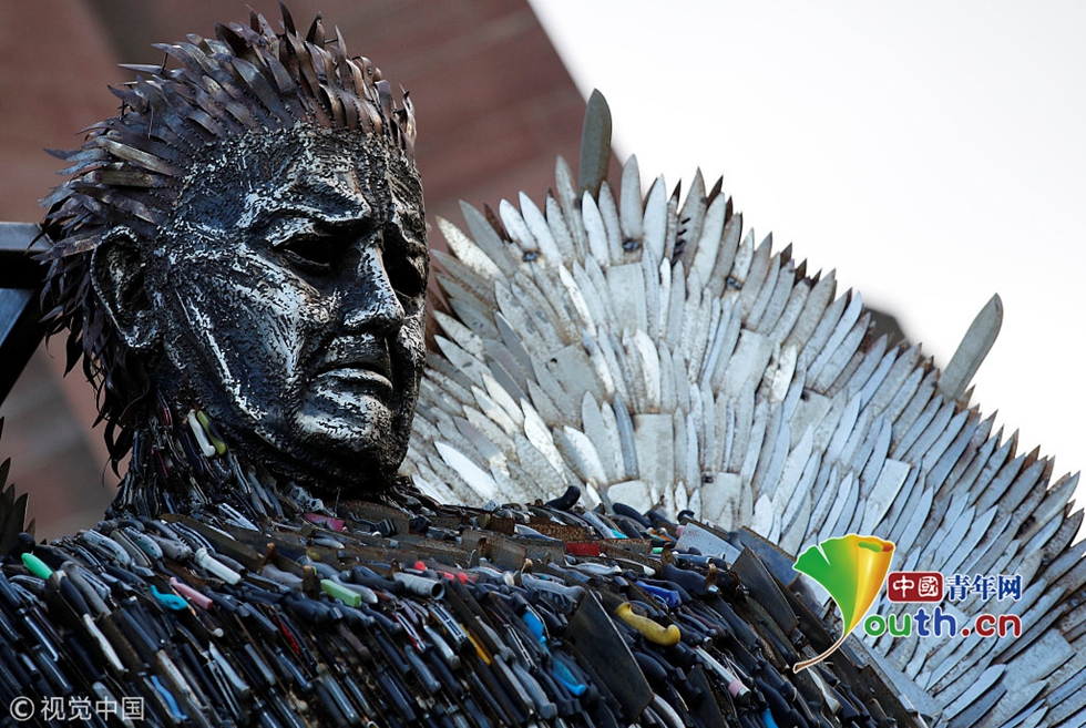 當(dāng)?shù)貢r(shí)間2018年11月29日,英國(guó)利物浦,藝術(shù)家阿爾菲·布拉德利在圣公會(huì)教堂外用沒收的10萬多把刀具制作了一尊名為“刀之天使”的塑像。