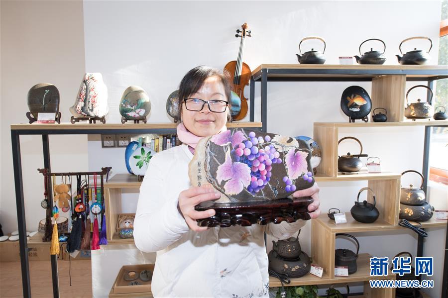 “農(nóng)民畫家”陳蘇蘭在開(kāi)設(shè)的工作室內(nèi)展示創(chuàng)作的石頭畫《下姜葡萄》(1月10日攝)。