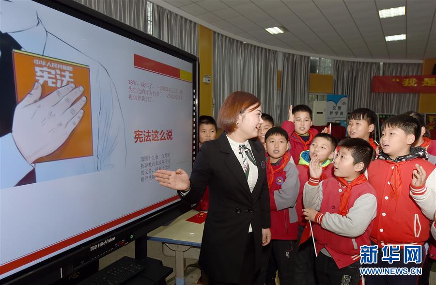 12月3日,合肥市經(jīng)開區(qū)明珠居委會法律援助律師在給明珠小學(xué)的學(xué)生們講解憲法知識。國家憲法日到來之際,各地學(xué)校紛紛舉辦主題宣講活動(dòng),對學(xué)生開展法治教育,幫助孩子們了解憲法知識。新華社記者 郭晨 攝