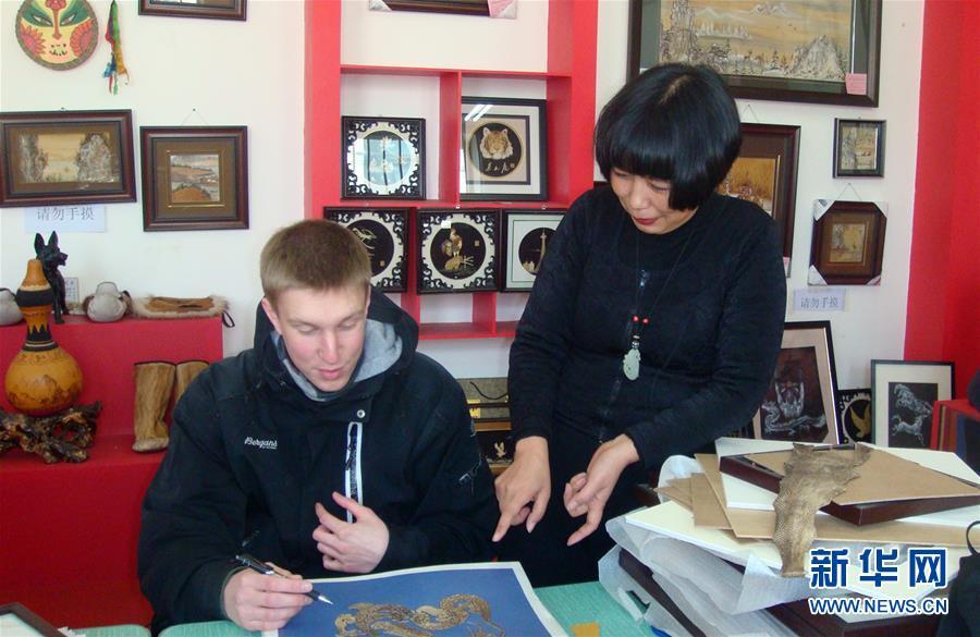 張琳在位于哈爾濱的工作室指導(dǎo)前來(lái)參觀學(xué)習(xí)的外國(guó)學(xué)生制作魚皮畫(2011年3月20日攝)。國(guó)家級(jí)非物質(zhì)文化遺產(chǎn)赫哲族魚皮制作技藝是我國(guó)赫哲族傳統(tǒng)手工藝術(shù)。作為這項(xiàng)技藝的黑龍江省級(jí)傳承人,十余年來(lái),張琳一直從事魚皮畫的研究和創(chuàng)作,并通過做推廣、開講座、辦活動(dòng),讓更多年輕人了解并喜歡上這一傳統(tǒng)手工藝,將這項(xiàng)瀕臨失傳的藝術(shù)更好地傳承下去。新華社發(fā)