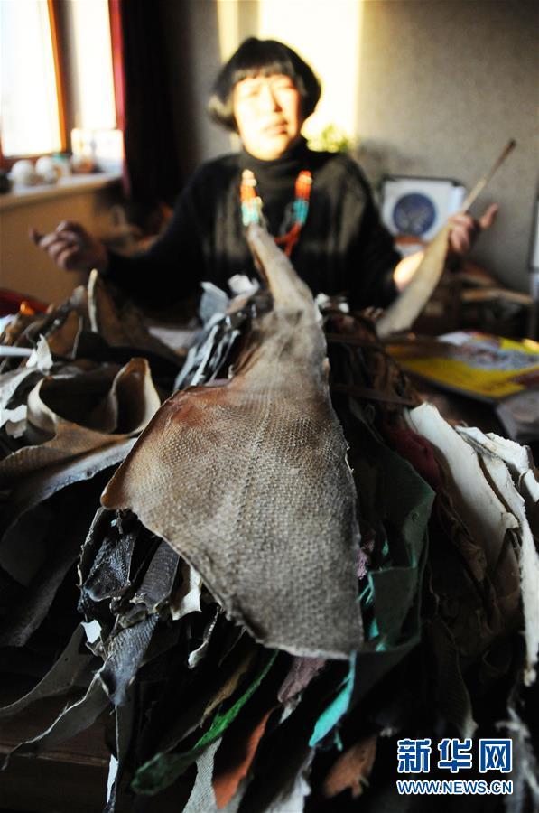 張琳的工作室堆滿了魚皮(2011年11月28日攝)。國(guó)家級(jí)非物質(zhì)文化遺產(chǎn)赫哲族魚皮制作技藝是我國(guó)赫哲族傳統(tǒng)手工藝術(shù)。作為這項(xiàng)技藝的黑龍江省級(jí)傳承人,十余年來(lái),張琳一直從事魚皮畫的研究和創(chuàng)作,并通過做推廣、開講座、辦活動(dòng),讓更多年輕人了解并喜歡上這一傳統(tǒng)手工藝,將這項(xiàng)瀕臨失傳的藝術(shù)更好地傳承下去。新華社記者 王凱 攝