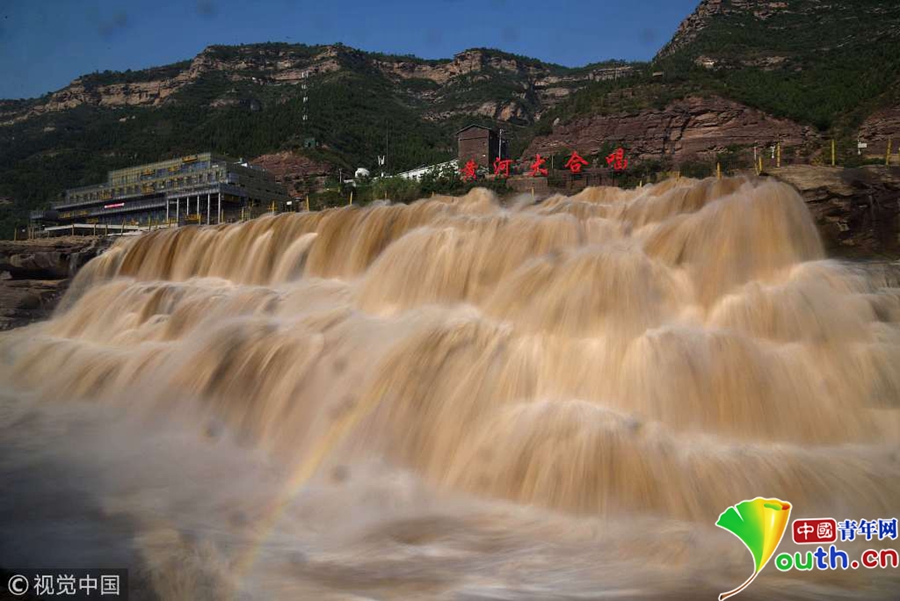 5月31日,山西臨汾奔騰咆哮的黃河壺口瀑布吸引游客。近日,受上游地區(qū)降雨量增多影響,黃河干流晉陜峽谷水量大增,每秒流量達到1100立方,是常年同期的三倍,壺口瀑布出現(xiàn)五月份罕見的瀑布群景觀,吸引了眾多游客。圖片來源:視覺中國