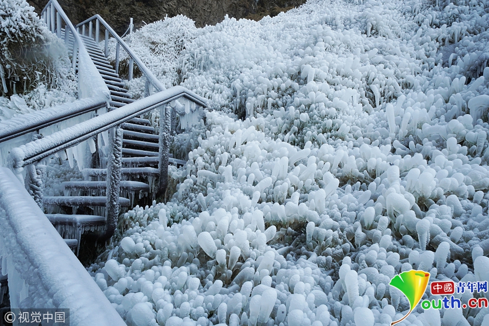 近日,冰島的塞里雅蘭瀑布在零下12攝氏度的氣溫下結(jié)冰,畫面彷如天外仙境。圖片來(lái)源:視覺中國(guó)