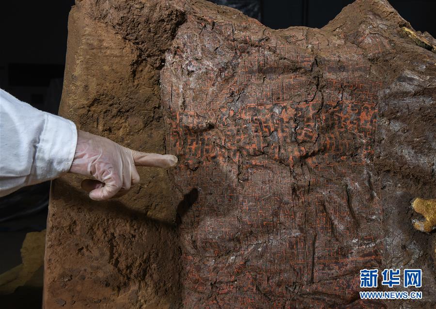這是在位于河北行唐的考古實(shí)驗(yàn)室內(nèi)拍攝的裝飾有繁復(fù)髤漆彩繪圖案的車廂遺存(12月4日攝)。新華社記者 李賀 攝
